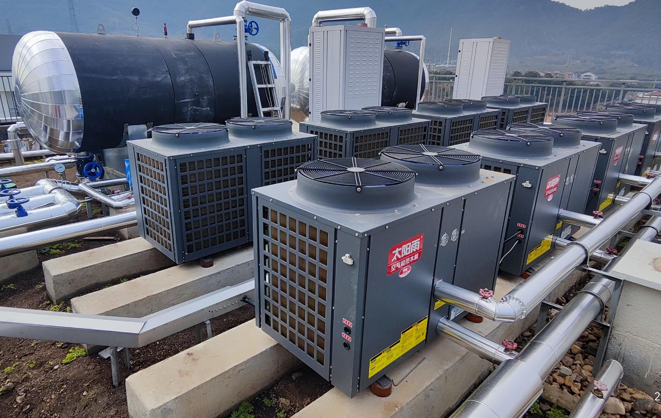 22 台 10HP 空气能热水机 + 6 台燃气锅炉
